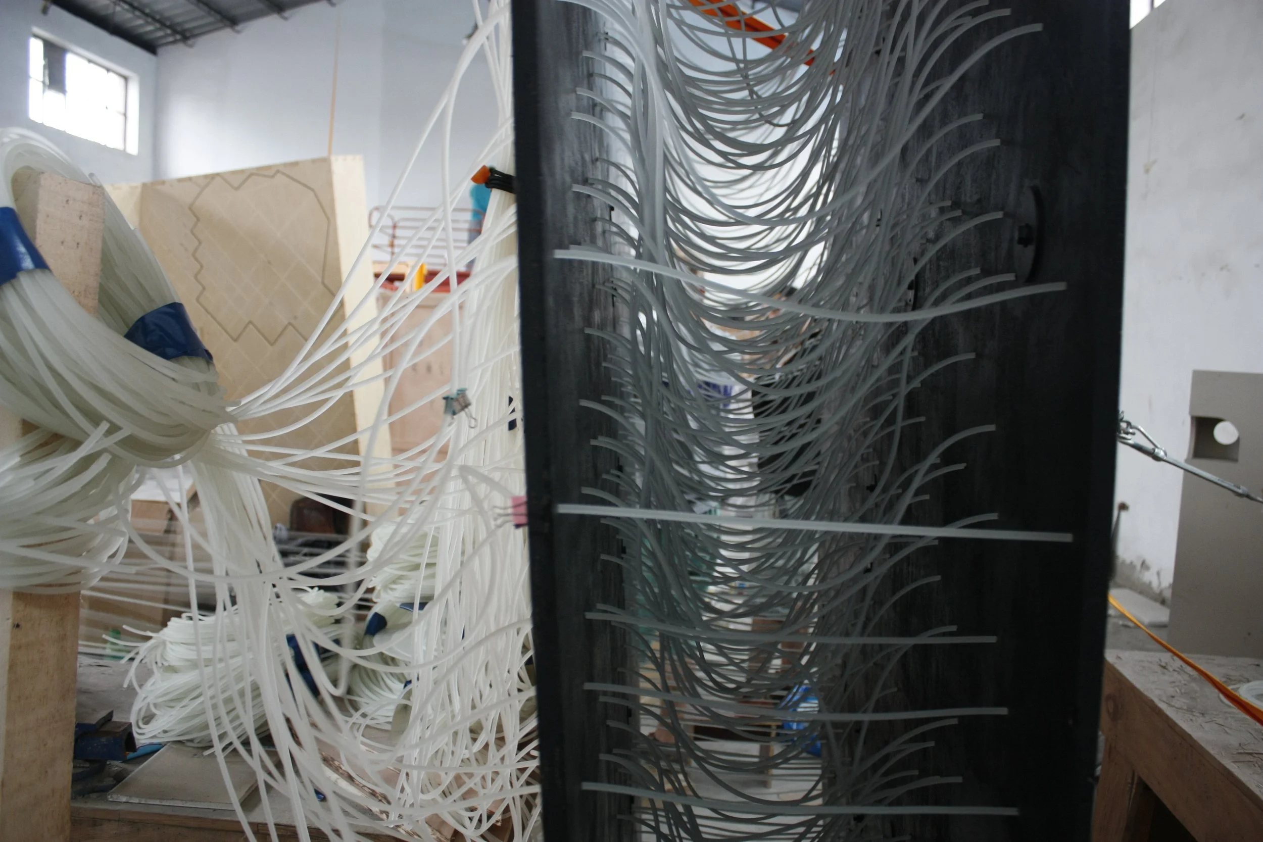 In 2012, together with friends, embarked on the journey of realizing a large scale version of the wiremap principle. It is an artistic approach to the concept of three dimensional visualization. Hologram 1.0 so to speak. Using 3D projection mapping, kilometers of strings and precise construction we achieved this. Essentially a 3d corpus made up of strings, each one mapped in virtual space. A projector aligned perfectly to hit every string.